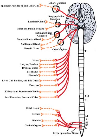 We will now turn our attention from the sympathetic division of the ANS to the parasympathetic portion. The parasympathetic division of the ANS is sometimes called the craniosacral outflow because the cell bodies of presynaptic parasympathetic neurons are located in the brainstem (nuclei of cranial nerves III, VII, IX, and X) and in the lateral horn of spinal cord segments S2, S3, and S4. In spinal cord segments T1-L2 the lateral horn is home to the cell bodies of presynaptic sympathetic neurons. The lateral horn is absent from L3-S1, but reappears in segments S2, S3 and S4 to house the cell bodies of presynaptic parasympathetic fibers. In general, when "the lateral horn" is mentioned, it refers to the T1-L2 sympathetic lateral horns, but don't get confused by the presence of a parasympathetic lateral horn in segments S2, S3 and S4.