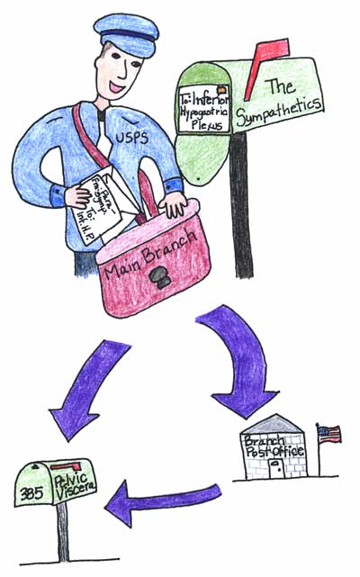 To use an analogy, the inferior hypogastric plexus can be compared in many ways to a main branch post office. A post office is responsible for taking in many types of correspondence from distant locations and redistributing them either directly to their final destinations, or to small branch post offices who then deliver them to their final destinations.