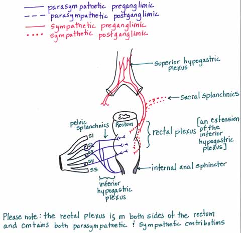 Autonomic Innervation of the Rectum: The rectal plexus is an offshoot of the posterior portion of the inferior hypogastric plexus. Nerves run from the inferior hypogastric plexus and penetrate the walls of the rectum providing enteric plexuses like those found in other parts of the intestines. Pelvic splanchnics (parasympathetics) innervate the internal anal sphincter that surrounds the upper two-thirds of the anal canal. During most times the internal anal sphincter is tonically contracted to prevent leakage of feces. Following distention of the rectal ampulla, the sphincter relaxes and then it is the job of the external anal sphincter, which is under voluntary control and supplied by the inferior rectal branches of the pudendal nerve, to prevent defecation.