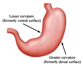 | As the stomach grows during the fourth week of development, the dorsal surface grows faster than the ventral surface. Consequently, the dorsal surface gives rise to the greater curvature and the ventral surface gives rise to the lesser curvature. The original dorsal and ventral surfaces of the stomach are associated with a dorsal and ventral mesentery (mesogastrium) throughout their development. | ![]() |