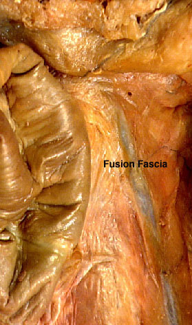 After the intestines return to the abdominal cavity, some portions press against the posterior abdominal wall and their mesenteries fuse with the parietal peritoneum. As a result, the duodenum, pancreas, ascending and descending colons adhere to the posterior abdominal wall and become secondarily retroperitoneal. The fusion of their visceral peritoneum and mesenteries with the parietal peritoneum of the posterior abdominal wall is called fusion fascia, and it is a relatively avascular plane that can be easily cleft during surgical procedures. |