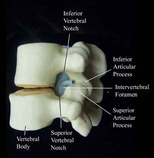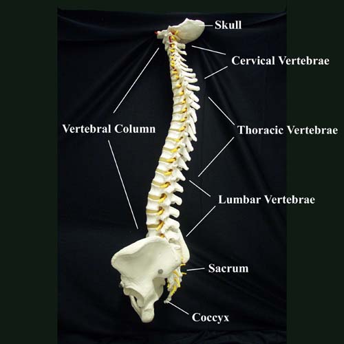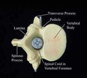 | The spinal cord is well-protected by the vertebral column, which extends from the skull to the coccyx, enclosing the entire cord. The vertebral column comprises 33 vertebrae: 7 cervical vertebrae, 12 thoracic vertebrae, 5 lumbar vertebrae, 5 sacral vertebrae, and 4 coccygeal vertebrae. In adults, the 5 sacral vertebrae are fused to form the sacrum and the 4 coccygeal vertebrae are fused to form the coccyx. The vertebrae are separated by tough fibrocartilage intervertebral discs that make up about one-fourth of the length of the vertebral column. While the structure of the vertebrae varies from one region to another, the spinal cord runs through the vertebral foramen in each vertebra. The vertebral foramen is bordered anteriorly by the vertebral body, laterally by the pedicles and posteriorly by the laminae. Thus, the spinal cord is entirely protected by bone. Nerves enter and exit the spinal cord through intervertebral foramina, which are enclosed by the inferior vertebral notch on the superior vertebra and the superior vertebral notch on the inferior vertebra. |