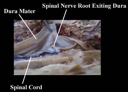 The spinal cord is further protected by three membranes, collectively called the meninges. The outer membrane surrounding the spinal cord is the dura mater (from Latin, meaning durable mother). The dura, made of a dense fibrous material, forms the dural sac, which surrounds the spinal cord and cauda equina (to be discussed later) and terminates at the level of the second sacral vertebra. The dura is separated from the vertebrae by the epidural fat in the epidural space (epi, meaning upon). The next layer is the delicate arachnoid mater which is thin and has web-like filaments connecting to the underlying pia mater (arachnoid is Greek for spider). Beneath the arachnoid mater is the subarachnoid space, which is filled with cerebrospinal fluid. Abbreviated CSF, cerebrospinal fluid bathes the brain and spinal cord as well as the cauda equina, providing protection, nourishment, and a medium for exchange of nutrients and waste. The innermost membrane surrounding the spinal cord is the vascular pia mater (Latin, meaning tender or devoted mother), which is very closely apposed to the spinal cord. The pia mater has paired specializations called denticulate ligaments, which extend laterally from the surface of the spinal cord and pierce the arachnoid to attach to the inner aspect of the dura mater at 21 pairs of denticulations (dentate means tooth-like - these are tooth-like lateral projections). The denticulate ligaments run longitudinally between the dorsal and ventral roots of the spinal cord and serve to suspend the spinal cord from side to side in the dural sac. The pia continues inferiorly from the end of the spinal cord (at the level of the second lumbar vertebra) as the filum terminale internum. As we said, the dural sac ends at the level of the second sacral vertebra (S2). Caudal to the end of the dural sac is a specialization of meninges called the coccygeal ligament (or filum terminale externum) that attaches the meninges, and consequently the spinal cord, to the coccyx. The coccygeal ligament is composed of specializations of all three layers of meninges. |
