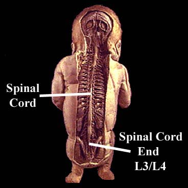 | While it seems somewhat counterintuitive that the spinal cord would end at the level of the first or second lumbar vertebra, (as is often the case in anatomy) the explanation lies in the embryological development of the spinal cord. In embryos, the spinal cord occupies the entire length of the vertebral canal, but during development the vertebral column grows faster than the spinal cord. Consequently, in an adult, not all spinal cord segments are found at the level of the vertebra of the same number. Because of the discrepancy between the spinal cord segment and the vertebral level, the spinal nerve roots of the more caudal spinal cord segments are rather long and descend for a significant distance before reaching their respective intervertebral foramina. It is these spinal nerve roots that compose the cauda equina beyond L1/L2. The fact that the spinal cord ends at L1/L2 is very useful in clinical practice in that it allows for spinal taps to be performed to sample CSF without the risk of puncturing the spinal cord. Below L1/L2 but above S2, there is still CSF contained in the dural sac (in what is called the lumbar cistern), but instead of a spinal cord there are only nerve roots, which float away from the positive pressure of a needle entering the space. Extreme caution must be taken in performing a spinal tap on an infant or a young child whose spinal cord may extend as far as vertebra L4 because their vertebral column has not reached its maximum length.