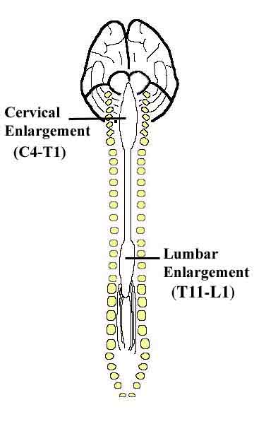 Another important feature of the spinal cord, which relates directly to its function, is its external shape. The spinal cord is shaped something like a glass soda-bottle. It has a cervical enlargement which begins at roughly C4 and extends to roughly T1 and a lumbar enlargement that extends from roughly the T11 vertebra through the L1 vertebral level. The cervical enlargement is the site of the cell bodies of the motor neurons that innervate the upper limbs, as well as the site where the sensory nerves from the upper limbs synapse. The lumbar enlargement is the site of the cell bodies of the motor neurons that innervate the lower limbs and the site where the sensory nerves from the lower limbs synapse. These segments of spinal cord are enlarged because of the extensive sensory input from the limbs, especially from the hands and fingers, as well as the complex and fine musculature of the limbs which requires significantly more innervation to control. |