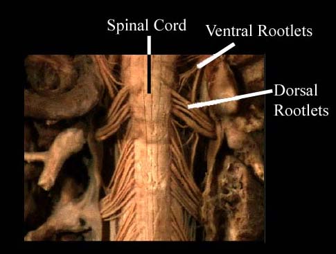 Spinal nerves are formed by the union of rootlets that originate from the dorsal and ventral horns of the spinal cord. The dorsal horn gives rise to several dorsal rootlets per section of spinal cord, and the ventral horn gives rise to several ventral rootlets per section of spinal cord. These rootlets converge to form the dorsal roots and the ventral roots, one from each spinal cord segment. Keep in mind that the dorsal horns are the location of the cell bodies upon which the afferent nerves from the periphery synapse. Hence, the dorsal roots and rootlets contain afferent fibers carrying sensory information from the periphery to the CNS. The ventral horns, on the other hand, are the home of the cell bodies for the motor neurons that carry motor information from the CNS to the periphery. Therefore, the ventral rootlets and roots contain efferent fibers. |