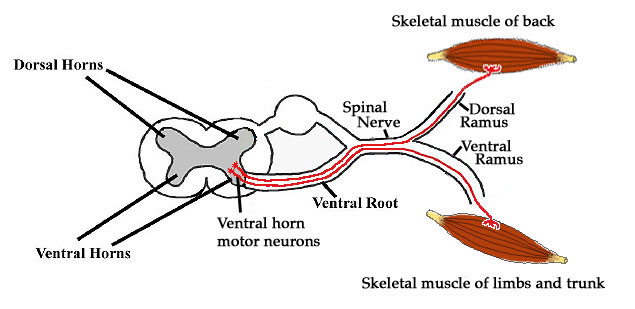 The ventral roots are formed by the axons of motor (efferent) neurons found in the ventral and lateral horns of the spinal cord. The lateral horns are related to the autonomic nervous system and will be covered in that learning module. The axons of the ventral horn cells (sometimes referred to as anterior horn cells) exit the spinal cord as multiple ventral rootlets that coalesce to form the ventral roots of the spinal nerves. The spinal nerves then distribute regionally by way of dorsal and ventral primary rami. The ventral horn cell axons traveling in the dorsal ramus innervate the skeletal muscle forming the true (paraspinal) back muscles. Those axons traveling in the ventral ramus innervate the skeletal muscle of the limbs and trunk.