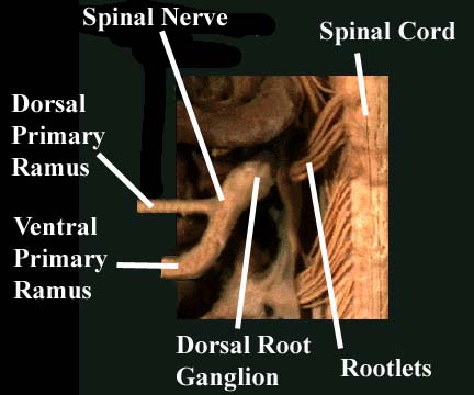 Shortly after exiting the intervertebral foramina, the spinal nerves branch into dorsal and ventral primary rami. Be careful! Dorsal primary rami and ventral primary rami are NOT the same as dorsal roots and ventral roots! Think of the spinal nerve as the trunk of a tree - the word ramus means branch in Latin, so the primary rami are the branches of a spinal nerve, whereas the roots unite to form the spinal nerve. These terms are very easy to confuse. The primary rami are mixed nerves carrying both motor and sensory fibers. The primary rami branch many, many times to provide innervation to almost the entire body. Nerves that branch from the dorsal primary rami supply the deep back muscles as well as the skin over the back. Nerves from the ventral primary rami supply the limbs and the rest of the trunk. |
