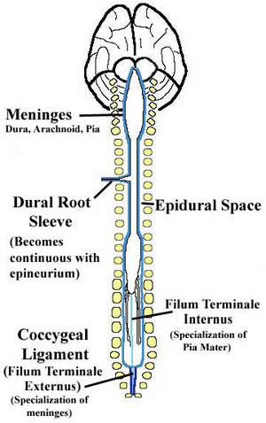 In summary, the spinal cord acts principally as a highway for information to travel between the brain and the periphery. The spinal cord begins at the foramen magnum and ends at L1/L2 as the conus medullaris. Caudal to the conus medullaris is the cauda equina, which consists of spinal nerve roots from the more caudal segments of the spinal cord. The spinal cord and most of the cauda equina is enclosed by the dural sac which ends at S2 and is connected to the coccyx by the coccygeal ligament. The 31 spinal nerves, which exit the spinal cord through the intervertebral foramina, are responsible for communicating between the spinal cord and the rest of the body. Dorsal rootlets from the dorsal horns and ventral rootlets from the ventral horns converge to form dorsal and ventral roots. The dorsal roots carry only sensory information and the ventral roots carry only motor information. Inside the intervertebral foramina are the dorsal root ganglia, the cell bodies for the peripheral sensory nerve fibers, which are pseudounipolar neurons. Distal to the dorsal root ganglia, the dorsal and ventral roots unite to form spinal nerves which are mixed nerves. The spinal cord gives rise to 31 spinal nerves, named for the vertebral segment where they exit the vertebral column. Spinal nerves are very short, branching shortly after exiting the intervertebral foramina into dorsal and ventral primary rami. The primary rami subsequently branch to supply the body. |