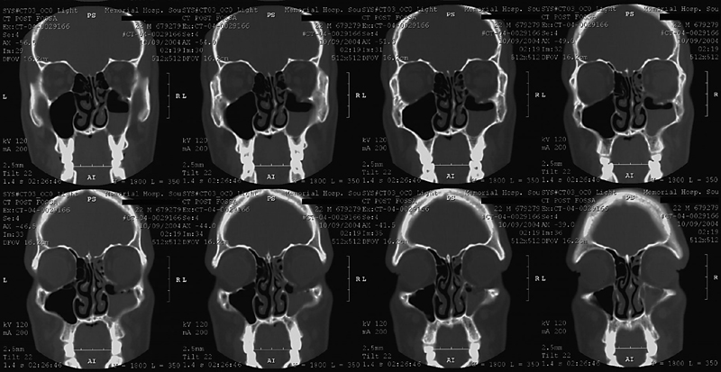 This CT shows what happens when the face of a medical student in the class of 2008 meets a hard object. Note the fracture of the orbital floor, with herniation of orbital contents into the maxillary sinus and accumulation of blood within the sinus.