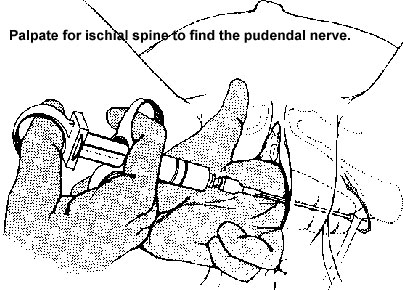 Two different methods may be used for a pudendal nerve block. In the transvaginal procedure, the ischial spine is palpated through the wall of the vaginaand the needle is then passed through the vaginal mucous membrane toward the ischial spine,
