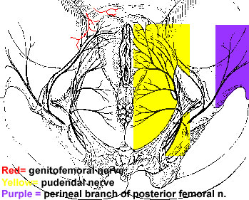 Complete anesthesia of the perineal region requires anesthetization of the genital branches of the genitofemoral nerve, the ilioinguinal nerve, and the perineal branch of the posterior femoral cutaneous nerve. This can be accomplished by making an injection along the outer margin of the labia majora.- Where is the best place to deliver anesthetic to perform a pudendal nerve block?