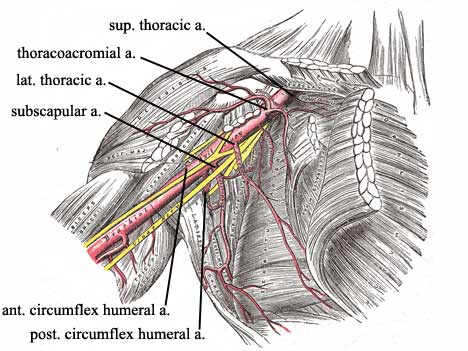 The axillary artery is the primary source of blood to the region. (It continues as the brachial artery, which supplies the upper limb.) The artery proper, including all of its branches, will be given complete treatment with the axilla. For now, there are a few important concepts to begin thinking about.