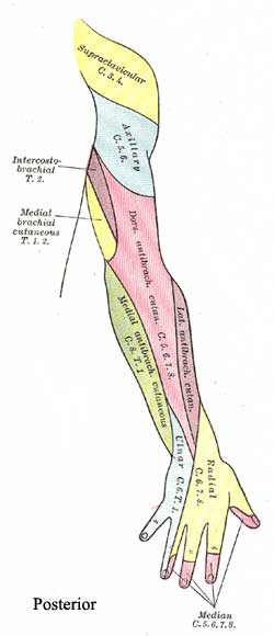 As for related cutaneous losses, check out a diagram of the cutaneous nerves of the upper limb.