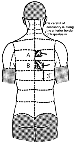 For the other strips, remove skin and subcutaneous tissue together (e.g. remove everything down to the deep, investing fascia) as indicated by Figure 1, as far laterally as the mid-line of the side of the body (mid-axillary line). The back of the neck is difficult because of its curvature. Let the head hang by putting a wooden block under the chest to straighten the neck and make access easier. The highest incision extends from the external occipital protuberance to the mastoid process and then along a line from the mastoid process laterally to the tip of the acromion process. Care must be taken not to cut too deeply along this line as the large spinal accessory nerve crosses the region quite superficially (see later for dissection of this nerve).
