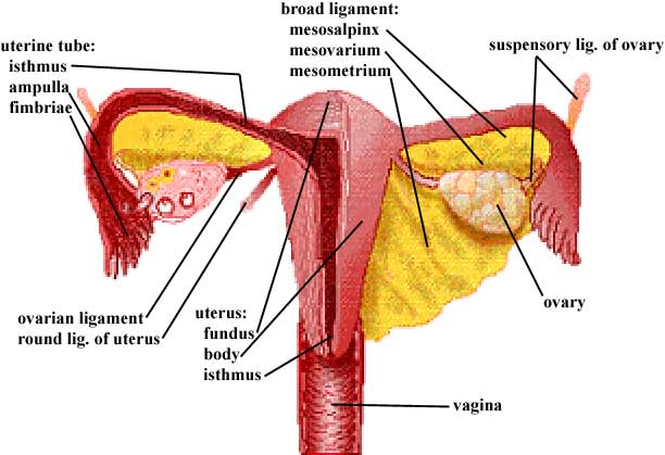 15. Identify the ovary and discuss the functional significance of its ligaments. (W&B 547-548, N 369, TG 6-07, 6-08, 6-11, 6-12)The broad ligament is a section of peritoneum, like a mesentery, which extends from the pelvic walls to the uterus and uterine (fallopian) tubes. Its three parts are continuous with each other, making it difficult to discern at their junctions. The mesosalpinx is the peritoneum that covers the uterine tube and hangs below it to meet with the mesovarium. The mesovarium is the peritoneum covering the ovary and ovarian ligament, extending like a shelf posteriorly from the mesosalpinx. (If you squint at the diagram in #11, you'll see a ridge of peritoneum running along the top of each ovary.) The mesometrium is the rest of the broad ligament - all of the peritoneum directly connected to the uterus and extending toward the lateral abdominal wall. (Greek, metra = uterus, from meter (mother);