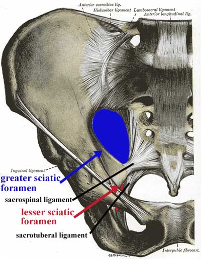 greater sciatic foramen: bounded anteriorly and superiorly by the posterior border of the hip bone (greater sciatic notch), posteriorly by the sacrotuberal ligament, and inferiorly by the sacrospinal ligament. The piriformis muscle passes through this opening, as do these nerves and vessels: