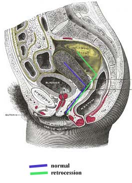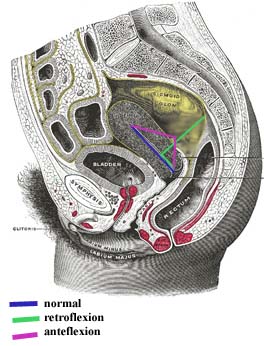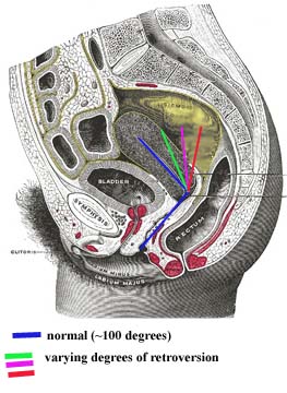 Female: The uterus is more or less horizontal in orientation. It actually lies upon the bladder, so its vesical surface is partially anterior but mostly inferior. Its intestinal surface faces the pelvic cavity. Deviations from this "flopped over the bladder" position can happen. Terms that are "________version" refer to the angle between the long axis of the uterus and the long axis of the vagina. This angle is usually about 100 degrees. Cases where the uterus stands more vertically, and therefore that angle approaches 180 degrees, are called RETROversion. Terms that are "________flexion" refer to the long axis of the body of the uterus as compared to the long axis of the uterine cervix. The long axis of a normal body of the uterus is relatively horizontal, while in the cervix the axis turns partially vertical. With RETROflexion the uterus is actually flopped back, away from the bladder. With ANTEflexion, the uterus is kinked, with a marked angle between the long axis of its body and the long axis of its cervix. (A slight bit of anteflexion is very normal.) Cases where the entire uterus, cervix and all, is moved posteriorly are called retrocession. The vagina is longer here.