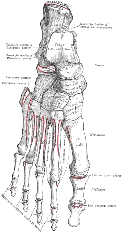 Muscle Origin Insertion Action Innervation extensor digitorum brevis superolateral surface of calcaneus extensor expansion of toes 2-4 (tendon to hallux is called extensor hallucis brevis) extends toes 2-4 deep fibular (peroneal) nerve extensor hallucis brevis superolateral surface of calcaneus dorsum of base of proximal phalanx of hallux extends great toe deep fibular (peroneal) nerve