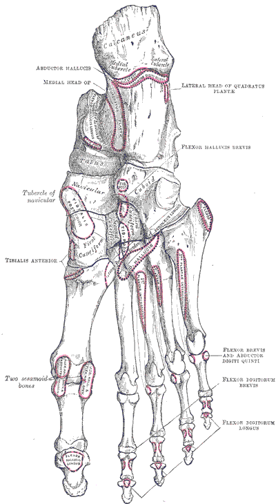 In summary, think about what you see as you take off the layers of the foot. First, you are confronted with the plantar aponeurosis. As soon as you peel it off, you see the flexor digitorum brevis muscle which runs from the calcaneus to mid-sole, and then has 4 tendons that go to toes 2-5. If you reflect it, you then see the flexor digitorum longus tendon and lateral to it is quadratus plantae muscle. (The latter muscle helps longus flex the toes in a straight line. Look at the tendon running from the medial malleous obliquely across the sole. By itself it would flex the toes medially.) Reflect this layer, and you see the adductor hallucis muscle. It is the one with both a transverse and an oblique head. You will also see the interosseous muscles between the metatarsal bones. The dorsal interosseous muscles abduct (DAB) the 2nd, 3rd, and 4th toe. (Since the midline is the 2nd toe, one can abduct this toe in two directions. Hence, it gets 2 muscles, one on either side, for abduction. The 3rd and 4th toes each get one of these muscles, and because one wants to abduct the toes, the muscles must be on the lateral side of the metatarsals. The big toe and the little toe have their own abductors.) The plantar interosseous muscles adduct (PAD) the 3rd, 4th, and 5th toes, i.e. pull them towards the second toe. (Therefore, these muscles must be on medial side of the bone. The second toe's adduction occurs simply by relaxing the abductors. The big toe has its own adductor muscle.)The dorsalis pedis, the continuation of the anterior tibial artery, has many branches, and eventually becomes the deep plantar artery. This artery dives to the sole of the foot (between the 2 heads of the 1st dorsal interosseous muscle, between the 1st and 2nd toes). It unites with the lateral plantar artery to form the plantar arterial arch.12. Identify the nerves of the foot, and the muscles and cutaneous regions supplied by them, so that given a functional and/or cutaneous loss one can predict the nerve and the probable level of injury. (W&B 581, 621-622, TG3-49, TG3-50, TG3-51)