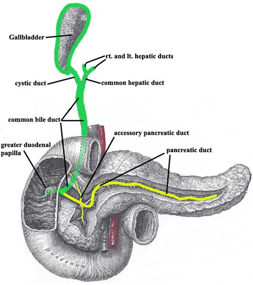 Usually, the main pancreatic joins the bile duct right before entering the duodenum, so they both dump their contents via the greater (major) duodenal papilla (comprised of the hepatopancreatic ampulla, or ampulla of Vater, and the sphincter of Oddi). There is variation in this anatomy, for example, independent dumping of the pancreatic and bile ducts into the duodenum via separate papillae (N N297,TG5-26).