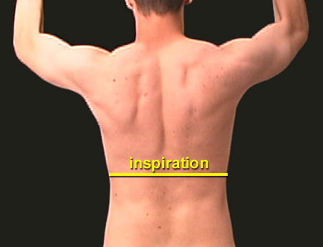Roll mouse over image to display EXPIRATION of the lungs. Note the level of dullness rises as more diaphragmatic muscle contacts the posterior abdominal wall. |