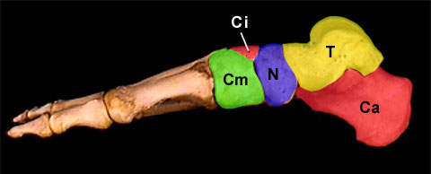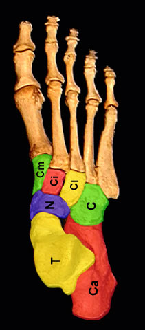 Tarsal bones: Ca - Calcaneus T - Talus N - Navicular C - Cuboid Cl - Lateral Cuneiform Ci - Intermediate Cuneiform Cm - Medial Cuneiform